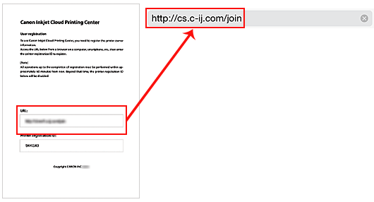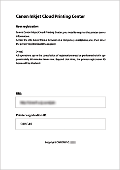 Follow the instructions displayed in the window, and print the URL of the authentication site and the Printer registration ID