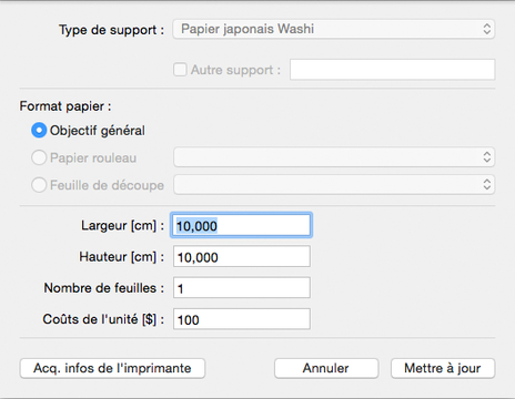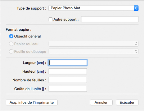 Définissez le Type de support, le Format papier et les Coûts de l'unité.