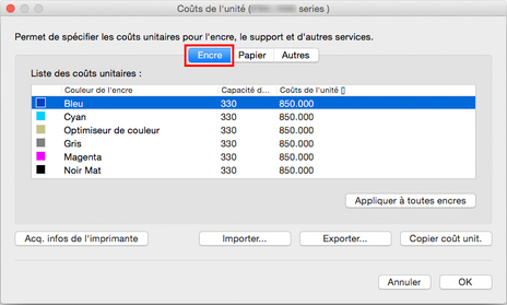 Le coût de l'unité et la capacité du réservoir de l'encre sélectionnés sont appliqués à toutes les couleurs d'encre.