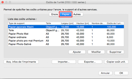 Configurez les coûts de l'unité, y compris les coûts de l'encre et du papier