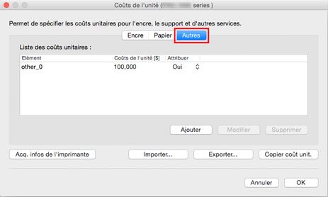 Définissez les coûts autres que ceux de l'encre et du papier sur la page Autres.