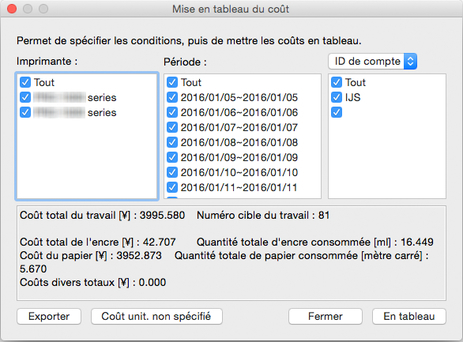Spécifiez l'Imprimante, la Période et l'ID de compte/Propriétaire pour la mise en tableau du coût.