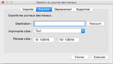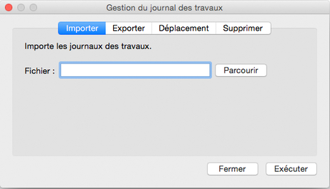 Vous pouvez exporter et importer les journaux de travaux récupérés sous forme de fichier. Ce fichier peut être utilisé si vous remplacez l'ordinateur utilisé pour la gestion, modifiez la destination des journaux de travaux ou augmentez la capacité du disque dur.