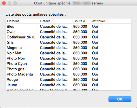 Vous pouvez vérifier une liste de coûts de l'unité définis pour cette imprimante dans la boîte de dialogue Coût unitaire spécifié.