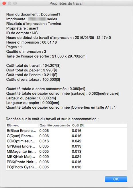 Le coût et la consommation totale par couleur d'encre et type de support s'affichent.