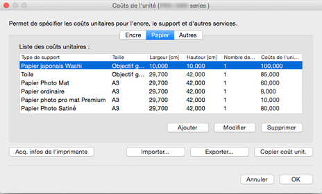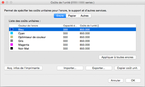 Les coûts de l'unité pour la Couleur de l'encre et la Capacité de la cartouche d'encre s'affichent.