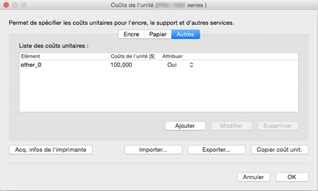 Permet de spécifier l'imprimante et les éléments, puis de copier les paramètres de coût unitaire.
