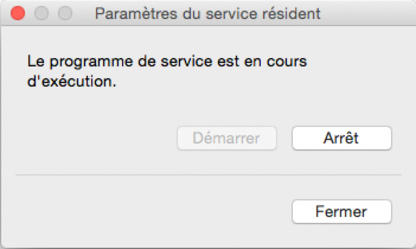 Vous pouvez afficher l'état de fonctionnement du service résident et contrôler le démarrage et l'arrêt de celui-ci dans les Paramètres du service résident.