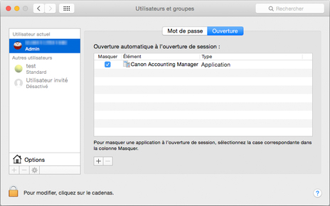 Lorsque le service résident est lancé, Accounting Manager apparaît dans la liste Préférences Système > Utilisateurs et groupes > Ouverture du système d'exploitation.