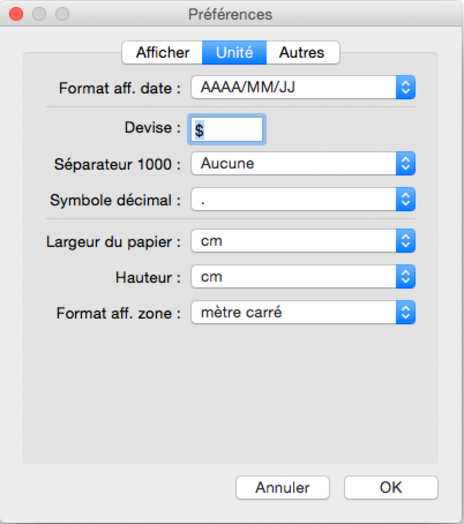 Cette boîte de dialogue comprend les pages Afficher, Unité et Autres.