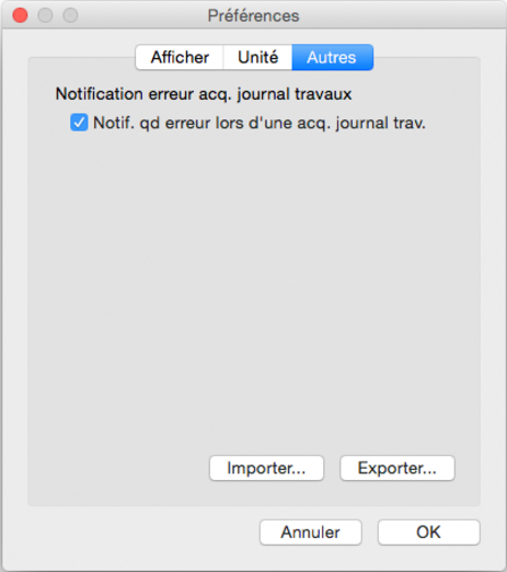 Sélectionnez si une notification doit s'afficher sur l'écran principal lorsqu'une erreur d'acquisition de journaux de travaux survient.