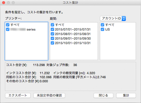 [プリンター]、[期間]、および[アカウントID]/[オーナー]で集計の対象となる条件を指定します。
