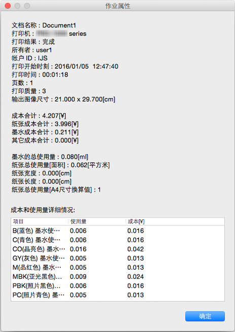 显示成本以及每种颜色墨水和每种介质类型的总使用量。