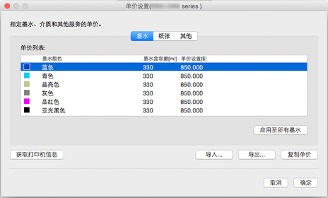 将墨水颜色中当前选择的单价设置和墨水盒容量应用于单价列表中显示的所有墨水颜色。