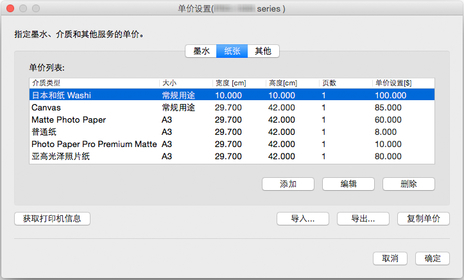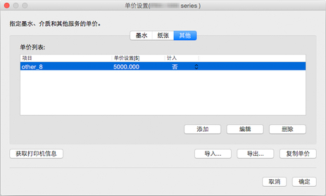 在单价设置对话框中设置用于计算作业成本的单价。 设置墨水、纸张以及除墨水和纸张以外的项目单价。