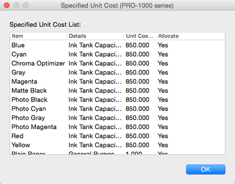 You can check a list of unit costs set for this printer in the Specified Unit Cost dialog box.
