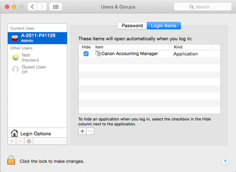 When the resident service is started, Accounting Manager appears in the list in the operating system's System Preferences > Users & Groups > Login Items.
