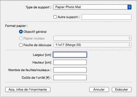 Définissez le Type de support, le Format papier et les Coûts de l'unité.