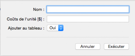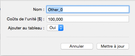 Définissez le Nom, les Coûts de l'unité et Ajouter au tableau.