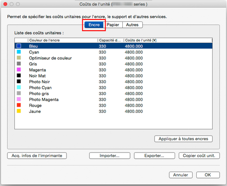 Le coût de l'unité et la capacité du réservoir de l'encre sélectionnés sont appliqués à toutes les couleurs d'encre.