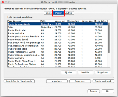 - Modification des coûts de l'unité pour le papier