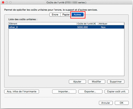 Définissez les coûts autres que ceux de l'encre et du papier sur la page Autres.