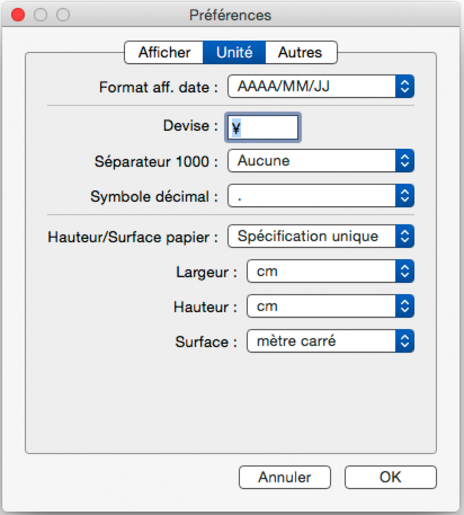 Définissez les unités affichées dans Accounting Manager sur la page Unité de la boîte de dialogue Préférences.