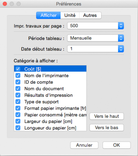 Pour ouvrir la boîte de dialogue Préférences, sélectionnez Préférences dans le menu Canon Accounting Manager.