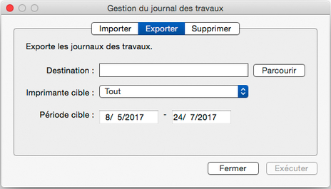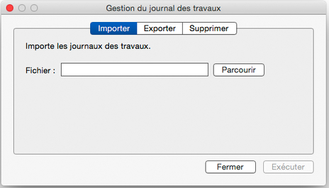 Vous pouvez exporter et importer les journaux de travaux récupérés sous forme de fichier. Ce fichier peut être utilisé si vous remplacez l'ordinateur utilisé pour la gestion, modifiez la destination des journaux de travaux ou augmentez la capacité du disque dur.