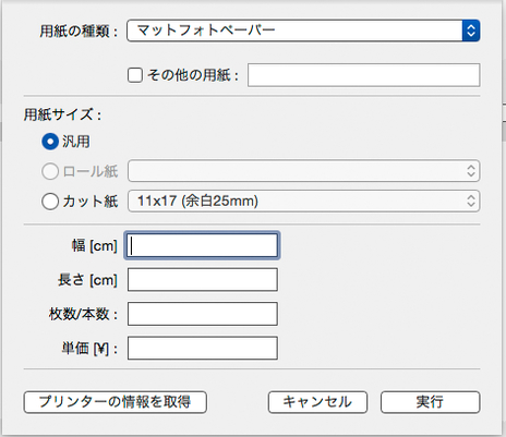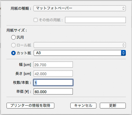 [用紙の種類]、[用紙サイズ]、[単価]を設定