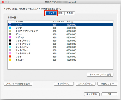 選んだインクの単価とタンク容量がすべてのインクに適用されます。