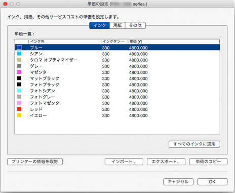 [インク色]および[インクタンク容量]に対する単価を表示します。