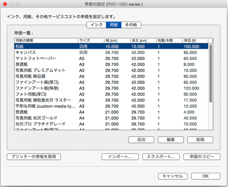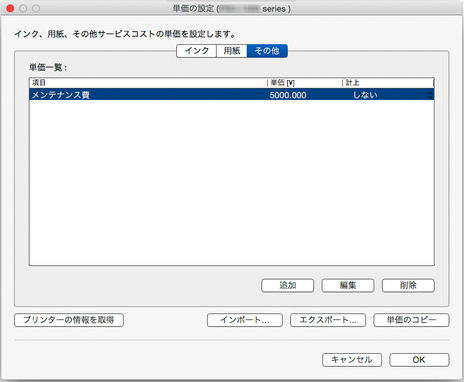 [単価の設定]ダイアログボックスでは、ジョブコストの計算に使用する単価を設定します。単価の設定は、インク、用紙、インク/用紙以外に対して行います。