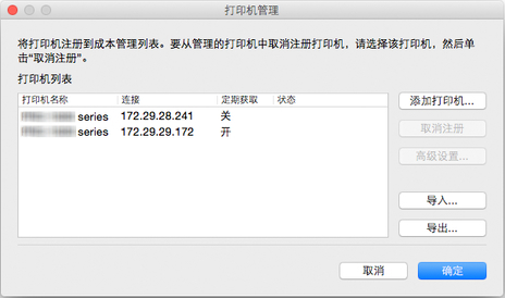 在打印机列表中选择的打印机在打印机管理对话框的打印机列表中显示为管理的打印机。