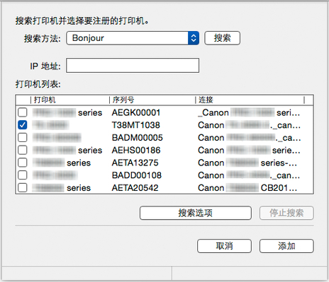 将显示通过Bonjour连接的打印机的Bonjour名称、通过IPv4和IPv6连接的打印机的IP地址以及通过USB连接的打印机的连接端口名称。