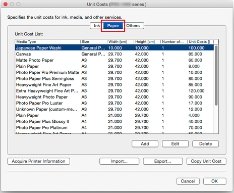 Legen Sie die Einstellungen für Medientyp (Media Type), Papierformat (Paper Size) und Kosten pro Einheit (Unit Costs) fest.
