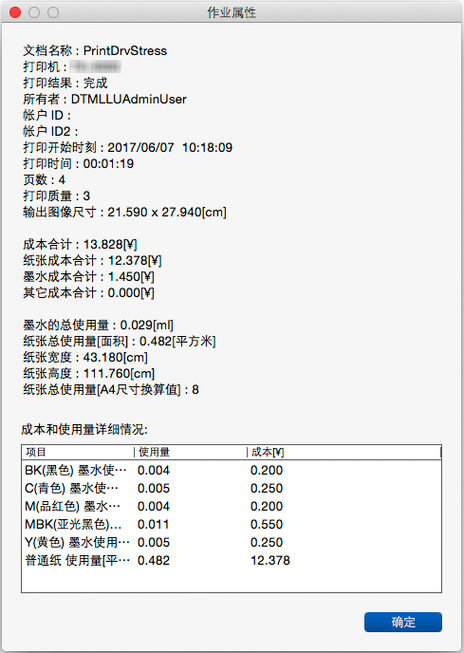 显示成本以及每种颜色墨水和每种介质类型的总使用量。