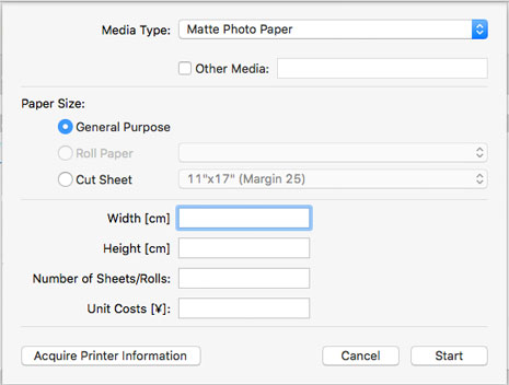 Wenn unter Papierformat (Paper Size) die Option Rollenpapier (Roll Paper) oder Einzelblatt (Cut Sheet) ausgewählt wird, erfolgt die Eingabe automatisch.