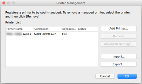 Les imprimantes ajoutées apparaissent dans Liste des imprimantes dans la boîte de dialogue Gestion de l'imprimante.