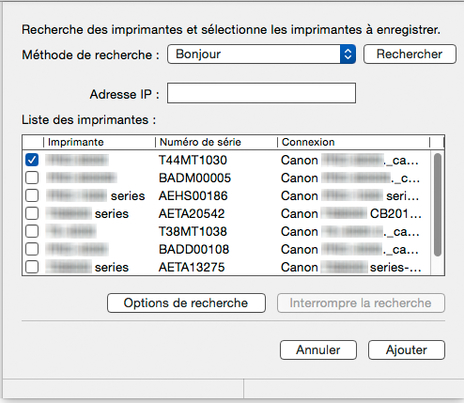 Sélectionnez Bonjour dans Méthode de recherche, puis cliquez sur le bouton Rechercher.