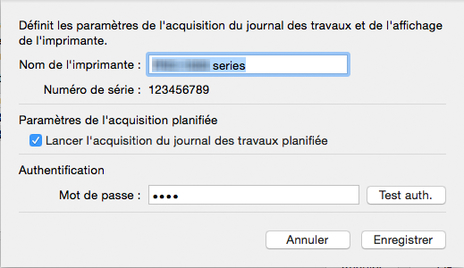Si l'historique des tâches est défini pour être masqué dans le panneau de commande de l'imprimante, les informations d'authentification sont requises lors de l'acquisition des journaux de travaux.