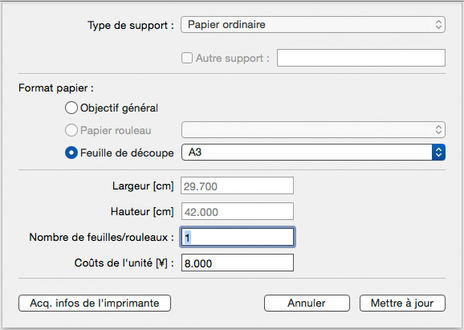 Définissez le Type de support, le Format papier, et les Coûts de l'unité.