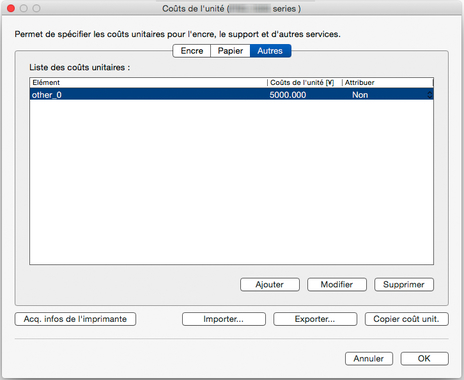 Définissez les coûts autres que ceux de l'encre et du papier sur la page Autres.
