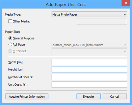 To set a unit cost for a paper not displayed in Media Type, select Other Media and enter the paper ID.