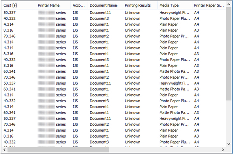 Items including Cost, Account ID, Document Name, Printing Results, Media Type, and Paper Consumed appear.