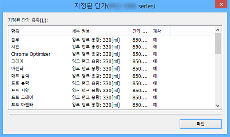 지정된 단가 대화 상자에서 선택한 프린터에 설정된 단가 목록을 표시할 수 있습니다.