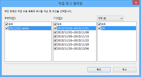 프린터 모두와 로컬 데이터베이스에 저장된 작업 로그를 포함하는 계정 ID 또는 소유자 목록을 각각 표시합니다.