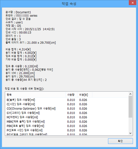 잉크 색 및 용지 종류당 비용과 총 사용량이 나타납니다.