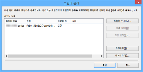 프린터 목록에서 선택한 프린터가 프린터 관리 대화 상자의 프린터 목록에 관리되는 프린터로 나타납니다.