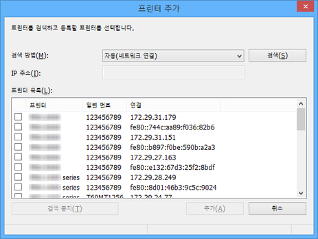 검색된 프린터 주소 정보(연결)가 나타납니다.